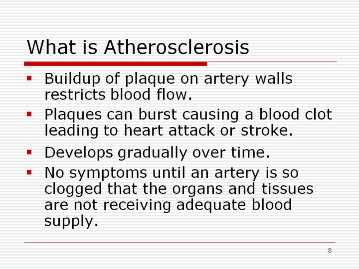 Atherosclerosis is the gradual buildup of plaques in the coronary arteries causing partial or complete blockage of an artery. These plaques can burst causing a blood clot leading to heart attack or stroke. This disease develops slowly and silently, over decades. It is often not diagnosed until it causes a heart attack because there are usually no symptoms until an artery is so clogged that the blood supply to the organs and tissues is affected.