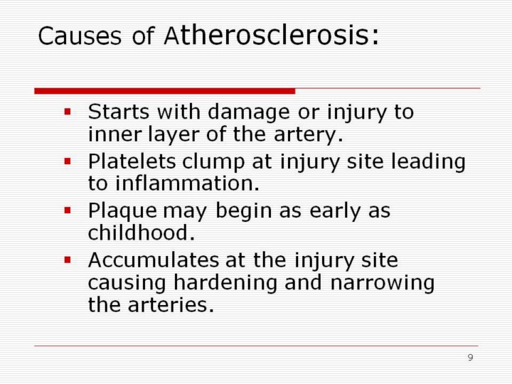 The exact cause of Atherosclerosis is unknown. But we do know that plaque attaches to an area of damage or injury in the artery that can be caused by: High blood pressure , High cholesterol, or an irritant, such as nicotine. Plaque development may even start developing in childhood. The accumulation of plaque causes hardening and narrowing the arteries.