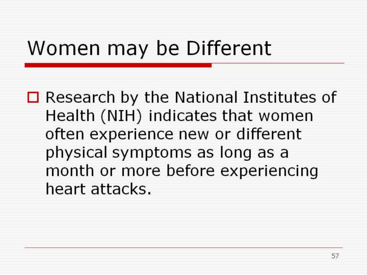 Women often experience very different symptoms from men. This is why diagnosis and treatment are often delayed. In a study by the NIH it was determined that 95% of women had symptoms that are not usually associated with a heart attack, a month or more before they had the heart attack.