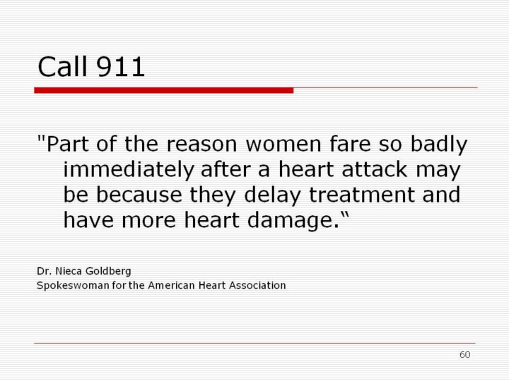 Dr. Nieca Goldberg, a spokeswoman for the American Heart Association, said "Part of the reason women fare so badly immediately after a heart attack may be because they delay treatment and have more heart damage," Goldberg said. Doctors must treat women more aggressively for risk factors like high blood pressure and high cholesterol, she said. "We have to encourage women to be aware of symptoms and go to the hospital. Don't think about it -- call 911."