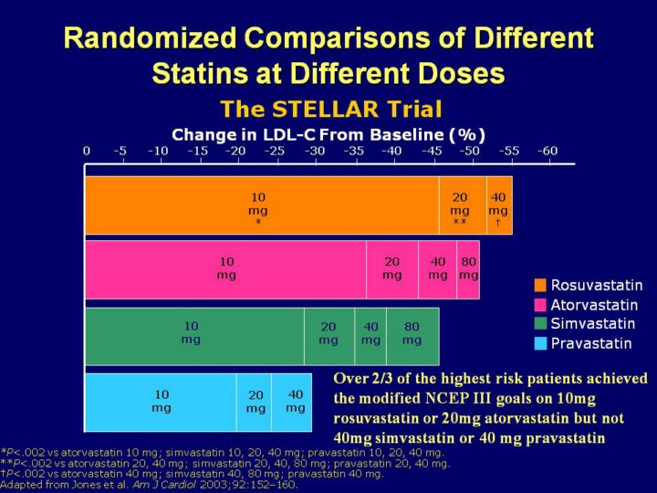 LDL-C This slide shows data from the STELLAR trial comparing rosuvastatin, atorvastatin, simvastatin and pravastatin across their respective dose ranges Rosuvastatin 10 mg resulted in a statistically significant greater percentage reduction in LDL-C compared with atorvastatin 10 mg; simvastatin 10 mg, 20 mg, or 40 mg; and pravastatin 10 mg, 20 mg, or 40 mg (P<.002) In a comparison of dose-response curves, rosuvastatin 10 mg to 40 mg reduced LDL-C significantly more than atorvastatin 10 mg to 80 mg (4.1%; P<.001)