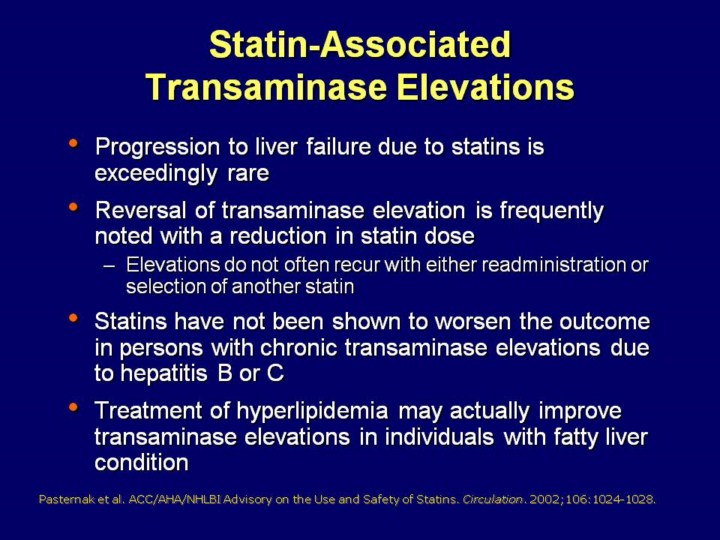 the Asymptomatic elevations in transaminases are observed in a small percentage of patients.1 Whether transaminase elevation with statin therapy constitutes true hepatotoxicity is unknown; however, progression to liver failure due to statins is exceedingly rare, if it ever occurs1 Reversal of transaminase elevation frequently occurs when the statin dose is reduced. These elevations often do not recur with readministration or when another statin is administered1,2 Moreover, statins have not been shown to worsen the outcome of patients with hepatitis B or C, and treatment of hyperlipidemia may actually improve transaminase elevations in patients with fatty liver condition1