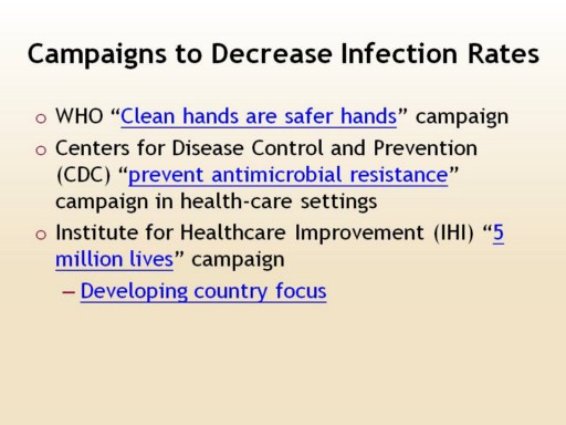 Recognizing this worldwide crisis, WHO established the campaign Clean hands are safer hands and joins other campaigns by addressing the high infection rates through the implementation of endorsed guidelines aimed at reducing death from transmission of health care-associated infections.