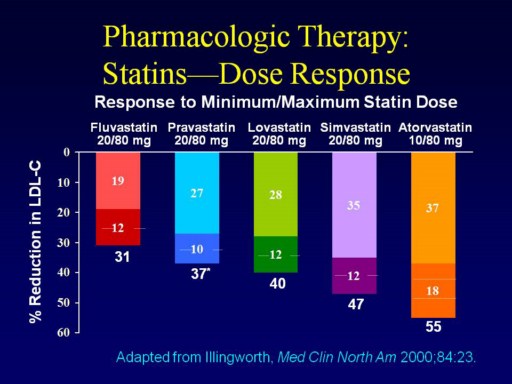 LDL-C reductions with a starting dose of different statins vary from 19% with fluvastatin to 27% with pravastatin, 28% with lovastatin, 35% with simvastatin, and 37% with atorvastatin. Doubling of a statin dose generally achieves a modest, 5%-6% incremental LDL-C reduction (“the rule of 6”). Three doublings of the atorvastatin dose (from 10 mg to 80 mg) result in LDL-C reduction 18% greater than that achieved with the starting dose (10 mg).