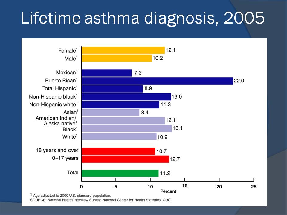 By race: 8.9% of Hispanics had a lifetime asthma diagnosis. 8.4% of Asians had a lifetime asthma diagnosis. 12.1% of American Indians/Alaska natives had a lifetime asthma diagnosis. 13.1% of Blacks had a lifetime asthma diagnosis. 10.9% of Whites had a lifetime asthma diagnosis.