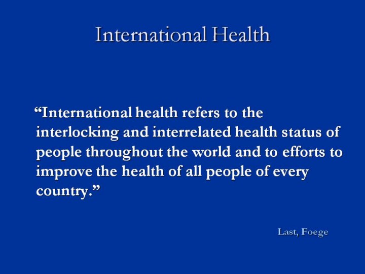 International health cannot be viewed either as disease or country specific. We need to examine all transboundary and transdisciplinary conditions that affect health. The word "international" is literally defined in terms of national borders, whereas the word "global" encompasses the entire world.