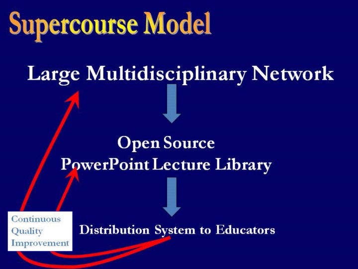 The supercourse model is simple. We first built a broad, global international network on the web. From the network we extracted the best of the best PowerPowerpoint lectures and put them onto the web. WE then build a distribution network to share the lectures. On top of this model we build state of the art quality control system. |