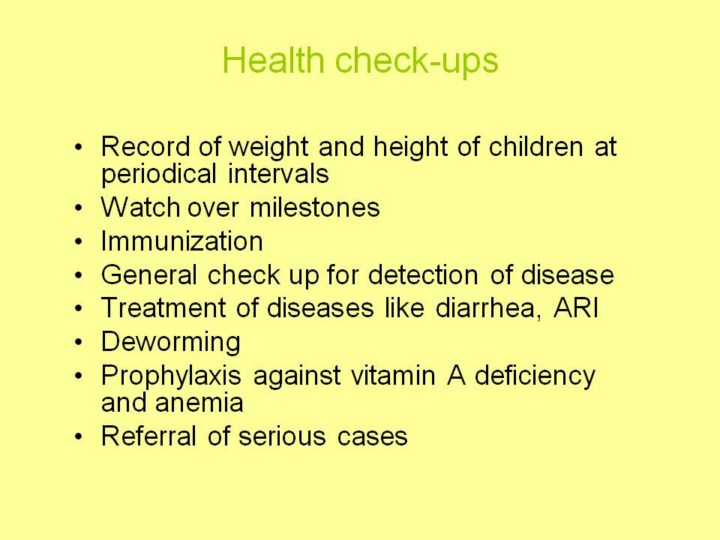 This includes health care of children less than six years of age, antenatal care of expectant mothers and postnatal care of nursing mothers. The various health services provided for children by anganwadi workers and Primary Health Centre (PHC) staff, include regular health check-ups, recording of weight, immunization, management of malnutrition, treatment of diarrhoea, de-worming and distribution of simple medicines etc. |