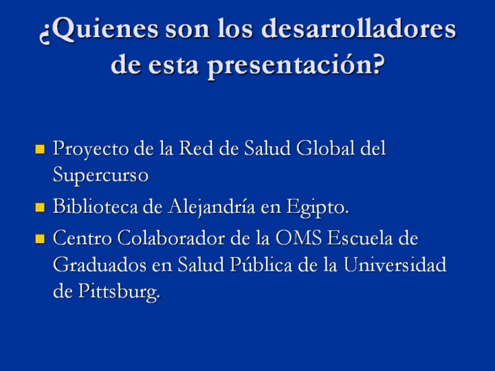 El Proyecto de la Red de Salud Global del Supercurso está colaborando con la Biblioteca de Alejandría en Egipto, para desarrollar el más grande almacén de presentación acerca de salud global. Por el lado de Pittsburg, la mayoría del trabajo está siendo realizado por el Centro Colaborador de la OMS para monitoreo de enfermedades y telecomunicaciones, bajo la dirección de Dr. Ron LaPorte. |