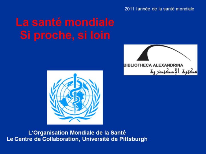 Cette présentation est dédiée au concept de santé GLOCALE - traduction de la santé mondiale du global au local. Le Projet de la Santé Mondiale du Réseau Supercourse (Global Health Network Supercourse Project) collabore avec la Bibliothèque d'Alexandrie, en Égypte, pour développer un des plus grands référentiels de lectures de santé mondiale. Du côté de Pittsburgh, la majorité du travail est faite par le biais du Centre Collaborateur de l'OMS pour la surveillance des maladies et les télécommunications, sous la direction de Dr Ronald LaPorte. Dr. Faina Linkov a été en charge de l'élaboration et la modification de cette présentation. La mission de ces diapositives est: 1) la prise de conscience de la santé mondiale pour les professeurs et étudiants dans le domaine médical, santé publique et professions annexées à la santé; 2) le développement d'un réseau mondial de la santé pour que les étudiants abordent les problèmes locaux et mondiaux de la santé. Une courte version de cette conférence est disponible sur le « Supercourse » à l'adresse www.pitt.edu/~super1/lecture/lec40541/index.htm