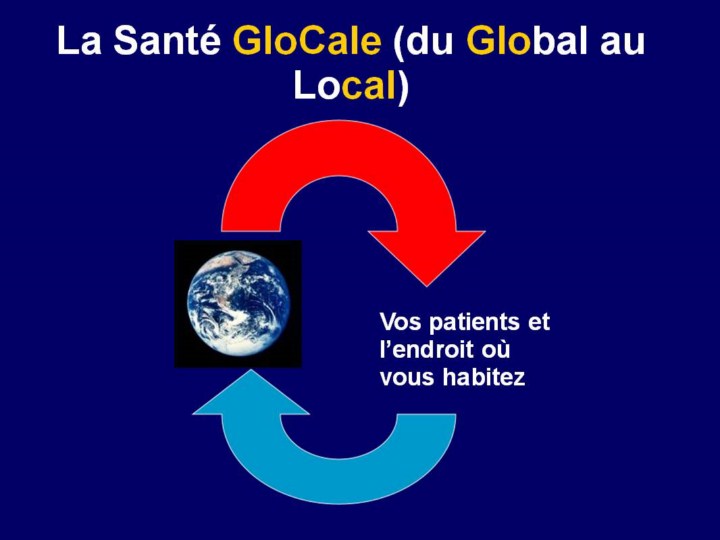 La santé en général est locale et mondiale; de ce fait, tous les médecins, les infirmières et les autres professionels de santé doivent se familiariser à la fois avec la santé locale et mondiale.