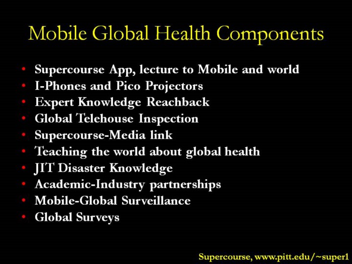 Here are some of the ways by which a Mobile Global Health Supercourse could develop. We are pushing the Supercourse lectures into mobiles with a Supercourse app. We have published several papers on Mobile technology and surveillance, not only for infectious diseases, but also chronic diseases. Linking a Supercourse App, with Iphones and pico projectors provides teaching technologies for even the remotes regions. With Mobile technology we can reach into intelligent networks to find help. One of the major concerns in disasters is that of habitability of houses. We are collaborating with the International association of certified house inspectors, to relay Cell pictures to a disaster reading center for houses to make judgments about habitability. In China they presented our infectious disease lectures to millions of people on TV. We have developed a global health lecture that is being distributed to all the medical and public health schools. The Mobile technology is ideal for providing rapid scientific knowledge at the time of a disaster. Both those in academia and business believe that we can improve the health of the world. We now have the opportunity to do global health surveys over mobiles. Supercourse, www.pitt.edu/~super1