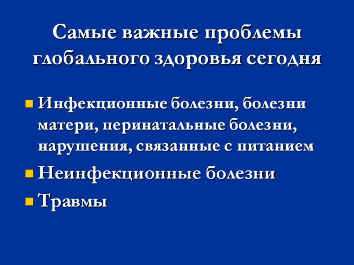Каковы наиболее важные проблемы мирового здоровья сегодня? В публикации 1996 года, The Global Burden of Disease, представлены данные 1990 года и прогноз до 2020 года по трем основным причинам, наносящим тяжкий вред здоровью: 1 – Инфекционные болезни, болезни матери, перинатальные и болезни, связанные с питанием; 2 - неинфекционные болезни; 3 – травмы. Внутри каждой из этих групп – множество специфических нарушений здоровья.