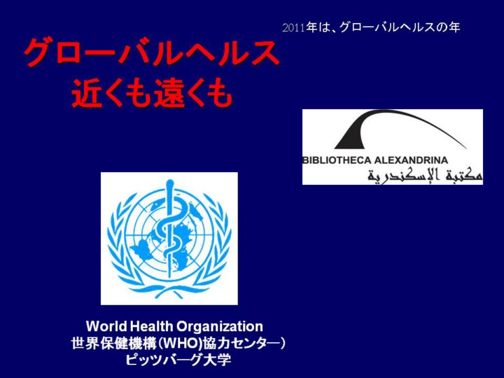 このスライドは、世界(global)と地域(local)の保健をつなぐGLOCAL Healthという構想に基づいたものです。Global Health Network のSupercourse Projectとは、エジプトのアレクサンドリア図書Library of Alexandriaと協力し、Global Health に関する講演を集めた一大資料庫を築くものです。 ピッツバーグ大学のウエッブサイトにおいては、WHO協力センターの疫学・遠隔通信部門が中心となって行っており、Dr. Ronald LaPorteの指導の下、Dr. Faina Linkov がプロジェクトの責任者となっています。このスライドの目的は、 1)医学・公衆衛生・その他の医療関連の教育者および学生に対し、グローバルヘルスについての関心を持たせること 2)学生によるグローバルヘルスのネットワークを発展させ、地域のものからグローバルな医療問題に取り組ませること としています。本スライドの拡張版はSupercourse のサイト www.pitt.edu/~super1/lecture/lec40341/index.htm