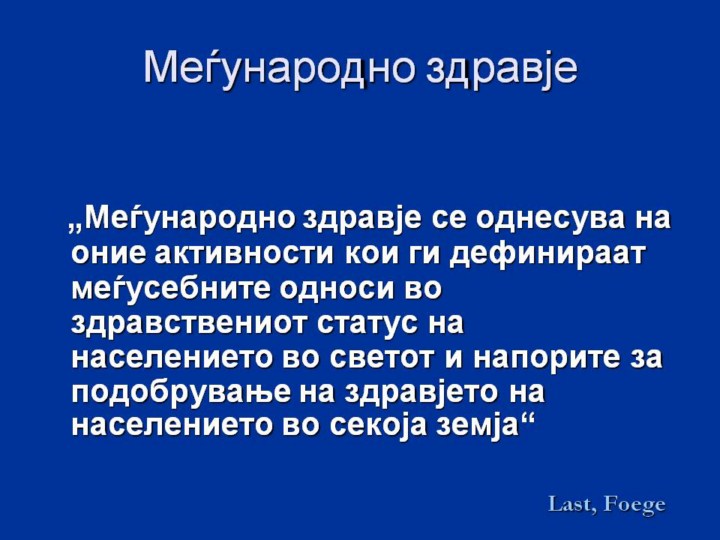 Меѓународното здраве не може да се разгледува само како болест или само како состојба специфицна за една земја. Треба да се набљудуваат сите меѓугранични и интердисциплинарни кои го афектираат човековото здравје. Зборот „инетнационално“ од јазичен аспект се дефинира како во однос на националните граници, додека зборот „глобално“ се однесува на целиот свет.