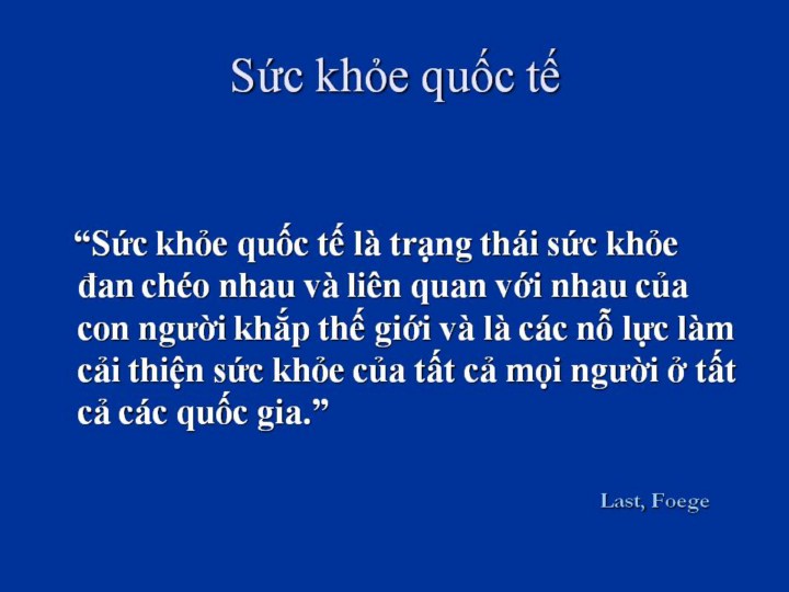 Sức khỏe quốc tế không thể được xem như là bệnh tật hay là vấn để đặc thù của quốc gia. Chúng ta cần kiểm tra tất cả các điều kiện xuyên biên giới và xuyên chuyên ngành ảnh hưởng đến sức khỏe. Từ “quốc tế” được định nghĩa theo nghĩa đen về phương diện các biên giới quốc gia, trong khi đó từ “toàn cầu" bao hàm toàn bộ thế giới.