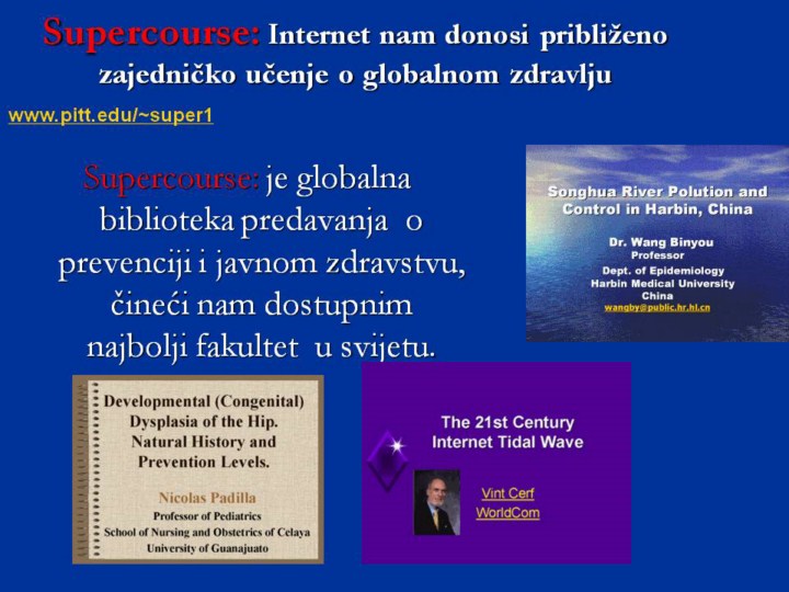 Supercourse www.pitt.edu/~super1 trenutno sadrži preko 4,650 lekcija koje su podijeljene u preko 46,000 fakulteta, u 172 zemlje članice. Supercourse je model suplementnog podučavanja gdje svjetski nastavnik dijeli svoje najbolje lekcije. Veliki broj Supercourse predavanja je posvećen temama o proučavanju globalnog zdravlja.