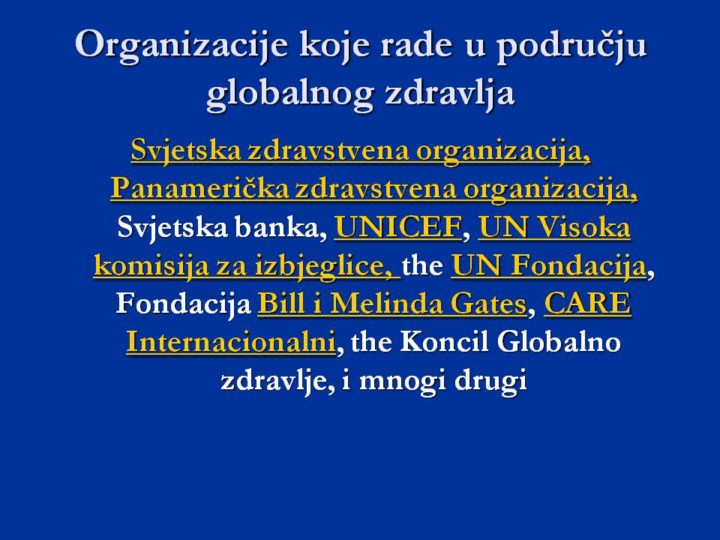 Kao što je prethodno pomenuto, postoji veliki broj važnih, multilateralnih organizacija, fondacija, ne-vladinih organizacija koje se zalažu za globalno zdravlje.