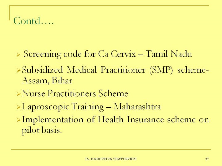 Nurse Practitioners Scheme– Similar to SMP scheme districts will identify villages where nurses can practice Midwifery and other minor ailment treatment on payment basis, they will be provided with honorarium, drugs etc. on a tapering basis for two years so as to settle their private practice. |