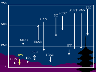 for Coronary Heart Disease by Country Men Ages 35-74, 1970 and 1993 (Rate/100,000) The same is true in women. Source:NIH, USA AUST: Australia, CAN: Canada, CHN: China, E&W: England and Wales, FIN: Finland, FRAN: France, HK: Hong Kong, NZ: ITY: Italy, JPN: Japan, New Zealand, SING: Singapore, SCOT: Scotland, SPN: Spain |