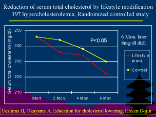 with hypercholesterolemia. We also conducted a randomized control study of lifestyle modification recruitment about 1100 men and women whose average levels of cholesterol were 236 mg/dl. From these studies, we think that it is relatively easy to reduce the levels of total cholesterol in Japan by lifestyle intervention; increasing the intake of fish and shellfish, and reducing the intake of meats. |