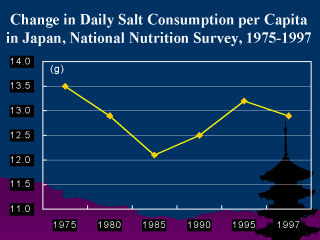 | The average salt intake in Japan around 1950 was about 20g/day and decreased during the subsequent two decades. Very unfortunately, we did not see great reduction in salt intake in Japan in the past 20 years. |
