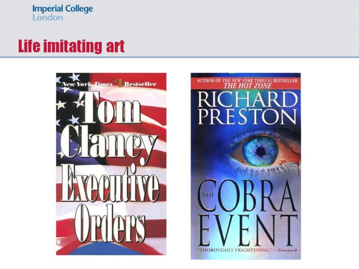 By 1997, as well as generating publications in the medical sphere, the subject of bioterrorism was also beginning to produce its own popular literature. Preston had learned of the US military’s interest in a possible bioterrorist attack whilst writing The Hot Zone, and after its success, he turned his hand to fiction with The Cobra Event (Preston, 1997), a novel in which terrorists released advanced biological weapons to attack US civilians. Preston again used his contacts in the CDC, the FBI and elsewhere for his research for the novel. Lederberg is said to have advised Preston not only on technical detail – to revise his original story from anthrax weapons to a less plausible biologically engineered superbug (Miller et al., 2001) – but also on the story line – advising him to let the assassin die of his virus at the end of the book, in order to deter possible real-life imitators (Sarasin, 2006). Similarly, Tom Clancey in his 1996 novel Executive Orders (a sequel to his 1994 novel Debt of Honor, which presciently envisaged a highjacked 747 jet attacking the Capitol Building) , imagined the President declaring a national state of emergency in response to a terrorist attack using an airborne strain of Ebola virus (Annas, 2003).