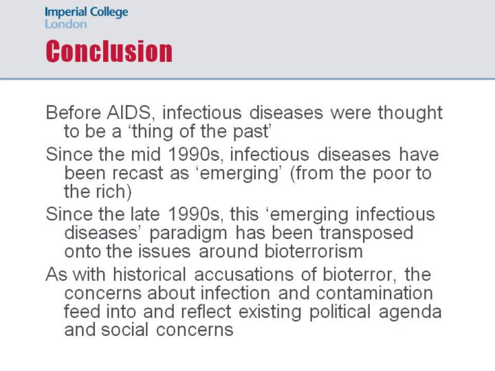 The issue of bioterror illustrates how the emerging infectious diseases worldview had become established to the extent that it became the ‘natural’ frame of reference to conceptualize the threat of bioterrorism. The blaming discourse around emerging infectious diseases, based on the antimony of the healthy self and the diseased other, is transposed onto the bioterrorism discourse, as are the militarized metaphors used to describe infectious disease – infections, invasions, terrorist ‘cells’, detection, defence, eradication and so on. The potential bioterrorist, like the infected other, threatens both individual citizens and the body politic from within or without. The response in both cases is to limit migration and to increase border security, and to introduce draconian legislation to limit civil freedoms in the name of public health and internal security. In other words, the 21st century response to the threat both of the infected other and of the bioterrorist is to revert to a more primitive group instinct: to regard outsiders with suspicion and fear and to seek to exclude them.