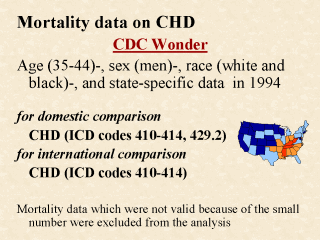 Classification of Diseases codes ninth revision (ICD). In comparing the mortality from CHD within the US, ICD codes 410-414 plus 429.2 were used. This is because in the US, code 429.2 is exclusively and extensively used by coroners to denote CHD that falls somewhat short of definitive evidence of a myocardial infarction, but was separated from the rest of codes for CHD in the ninth revision of ICD. Such deaths were coded 412.4 under the ICD eighth revision. ICD code 429.2 was not used for international comparison because it is not available from the World Health Organization Health Statistics Annual. Sorlie PD, Gold ED. The effect of physician terminology preference on coronary heart disease mortality: An artifact uncovered by the 9th revision ICD. Am J Public Health. 1987;77:148-152. |