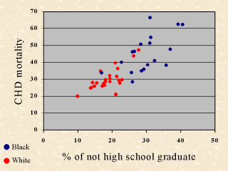 the largest 25 states by race CHD mortality (ICD 410-414, 4292.2) has a strong correlation with the educational attainment (Pearson correlation coefficient = 0.81, p<0.001: Spearman's rho = 0.81, p<0.001). CHD risk factors are generally inversely related to measures of socioeconomic status especially education. Therefore, we have hypothesized that states with higher mortality from CHD among men aged 35-44 would most likely include more individuals who are less educated. We examined the association of the race-specific data on not-a-high-school graduate in the largest 25 states with CHD mortality among black and white men aged 35-44 by state. Because the variable on socioeconomic status is not sex- and age-specific, there are limitations in evaluating the relation. CHD mortality (/100,000) |