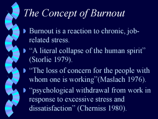 | It is an emotional state that may be accompanied by a number of physical and behavioral changes. It is also descirbed as the extend to which a worker has become seperated or withdrawn from the original meaning and purpose of his work (3-6). |