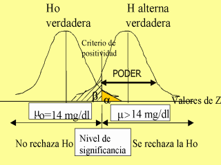 la población de la Ho. El error alfa es la proporción de mujeres de la población de la hipótesis nula (mujeres con hemoglobina igual a 14 mg/dL) que fueron considerados como parte de la población de la hipótesis alterna. El error beta es la proporción de mujeres que pertenece a la población de la hipótesis alterna (mujeres con hemoglobina mayor de 14 mg/dL) y que por el punto de corte han sido considerados como parte de la Ho. El poder es la probabilidad que tiene el estudio para concluir que la hemoglobina de las mujeres que viven en altura (altiplano) es mayor de 14 mg/dL |