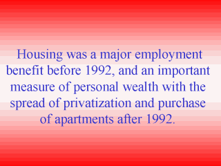 | A Moscow longitudinal survey on housing and economic characteristics, conducted annually by the Urban Institute between 1992 and 1995, indicated a growth in relative income inequality between Moscow residents: the largest increase in income (38%) occurred in the highest income group as opposed to only 8.7% in the lowest income group. |