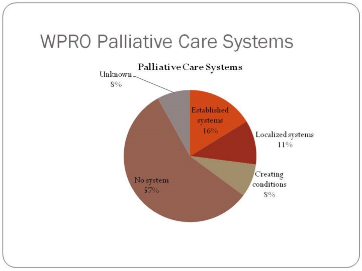 6 countries/territories (16%) have established palliative care systems. 4 countries/territories (11%) have a localized palliative care system serving some populations of people in the country. 3 countries/territories (8%) are working to create conditions conducive to the implementation of a palliative care system. 21 countries/territories (57%) have no palliative care system in place. 3 countries/territories (8%) were unknown on their status of having a palliative care system.