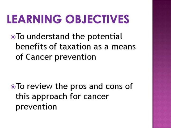 Taxes can prevent cancer indirectly by being placed on certain items which may be associated with the development of cancer. This approach may not be as effective as other ways of influencing society. |