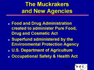 The early part of the 20th century saw a dramatic increase in industrialization and urbanization, which, in turn, increased threats to health in the form of the sale of adulterated and contaminated food products and pharmaceuticals. The Food and Drug Administration was created to administer the Pure Food, Drug and Cosmetic Act. Additional concerns and legislative action continue to this day. Later acts that continue to respond to this sort of threat include: - The Superfund Act administered by the Environmental Protection Agency to deal with long abandoned industrial hazards. - The US Department of Agriculture recently overhauled the meat inspection program to include modern laboratory methods for detecting bacteria in meat. - The Occupational Safety and Health Act is enforced by the Department of Labor and addresses occupational threats to health. - A debate that illustrates the tension in public health decision-making is the current one about whether the FDA authority extends to tobacco. The agency proposed regulations, the industry took it to court, and the Supreme Court ruled (March, 2000) that because Congress has declined to pass specific authorization, the FDA was overstepping its bounds. |