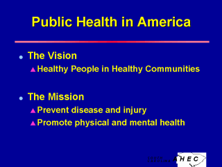 While these statements are definitely consistent with the IOM report of 1988, they care the concepts through to greater specificity. The vision of healthy people in healthy communities provides an excellent illustration of the intersection of personal and population-focused health efforts. There are many things that can be done to promote individual health, working serially with individuals, and healthy individuals can work together to promote a healthy community. Likewise, if the community itself is healthy, which requires working with people in their social or group interactions, it will be far easier to promote or protect the health of individuals. The mission stated here is that of the whole public health system or network. No one agency or individual is responsible for this mission, although there is a chief official health agency in each state and in most local jurisdictions. These public health organizations must work with the full range of health professionals and health-related organizations in the community to see that this mission is realized. This is a vision and mission that is nation-wide, and not attached to any one level of government or organizational entity. Accomplishing it will take the combined efforts of all components of the system. |