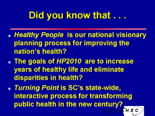This slide is included to identify for students that we do have a national process for applying the basic principles of the public health core functions. The process of working with a community to improve health will be presented in detail in Module 4, so no extensive discussion is expected at this point. The Healthy People Web site can be used as an assignment at this point as an introduction to the process. The Healthy People 2010 Objectives draft may be found at: |