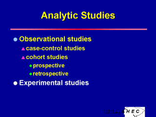 Case control studies: Case-control studies are those in which persons with a specified condition (the cases) and pesons without the condition (the controls) are selected for study. The proportion of cases and controls with certain characteristics or exposure is then measured and compared. For example, knowing that there are 10 school children with purple spots in grade 3, a set of other third grade children from the same school but without purple spots would be identified as controls, and analysis done to see what different exposures the purple-spotted children had than the non-spotted. Cohort studies: groups of individuals with some common feature (age and geography, for example) are identified for study over time to learn about differing health and illness experiences. For example, one might enroll in a study all third graders in a school and follow them until graduation, attempting to identify the differences in experiences of those who maintained a body weight close to recommended and those who did not. The next slides illustrate some of the differences in timing in these types of studies: case control, prospective cohort, and retrospective cohort. |