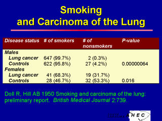 This table shows the association between smoking and lung cancer, taken from the historic study by Doll and Hill. Men and women with and without lung cancer were categorized as smokers or non-smokers. Thus, the exposure was smoking; the disease outcome of interest was lung cancer. Lung cancer among exposed individuals is far in excess of lung cancer among non-exposed individuals. |