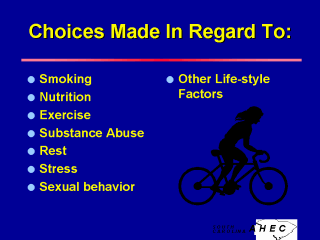 Lifestyle Factors As shown in the previous slide, these are some of the most significant lifestyle behaviors that are known to affect our health. We will discuss each one of them in detail. |