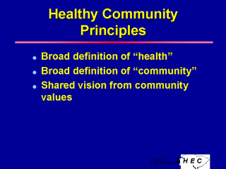 challenges, the most successful initiatives are guided by the following principles: A broad definition of “health” Health is not simply the absence of disease. It is defined broadly to include the full range of quality of life issues. It recognizes that most of what creates health is lifestyle and behavior related. Other major factors include genetic endowment, and the environment as defined by socioeconomic, cultural and physical factors. Health is a by-product of a wide array of choices and factors - not simply the result of a medical care intervention. A broad definition of “community” Using a broad definition of what makes up a community, individuals and partnerships can address their shared issues in the most fruitful way possible. Communities can be based on faith, perspective, land, and profession, as well as being determined by geographic lines. Shared vision from community values A community’s vision is the story of its desired future. To be powerful and inspiring, it should reflect the core values of its diverse members. A vision is not just a statement on the wall - it is a living expression of shared accountability to priorities. |