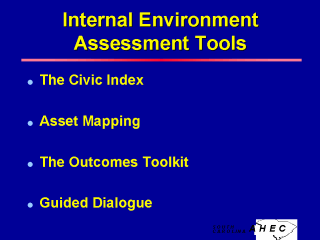 Visit www.healthycommunities.org and www.ncl.org/ncl/hci.htm#Principles The Civic Index: One of the first tools for understanding a community, the National Civic League developed this index to measure civic infrastructure; the capacity, both formal and informal, processes; and networks through which communities problem solve. It incorporates relationships and responsibilities of citizens, local government, business and non-profits in addressing community challenges. Asset Mapping: John P. Kretzman and John L. McKnight of The Asset-Based Community Development Institute, have designed numerous guides for developing inventories of community resources that define the community. Once completed inventories of individuals, business, and expenditure can then placed on a grid to see where each of these areas come together. Reading: Building Communities from the Inside Out: a Path Toward Finding and Mobilizing A Community’s Assets by John P. Kretzman and John L. McKnight The Outcomes Toolkit: This tool is designed for demonstrating community improvement and was designed The Healthcare Forum. It provides software for documenting the process and outcomes of improvement projects. There are three main screen in the program: 1. the community profile, 2. The community description input, and technical assistance and Gateway to the World Wide Web. Reading: The Outcomes Toolkit: The ultimate solution for demonstrating community improvement, outcome screens; The Healthcare Forum Guided Dialogue: Developed by the Coalition for Healthier Cities and Communities, this is a simplified focus group. It is a dialogue, a conversation with the community that can lead to action. It uses a framework for setting up and executing the dialogue. Tyler Norris and Linde Howell wrote the Dialogue Guide. Reading: Healthy People in Healthy Communities: a dialogue guide by Tyler Norris and Linde Howell. |