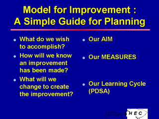 Continuous improvement focuses on improving processes, not individuals. Three simple questions lead to development of an aims statement, measures to document improvement, and a learning cycle. a plan of action, implementation and monitoring, review and study of the “doing”, and action to determine next cycle. It looks at small successes that over time lead to accomplishment of the aim. Question one relates to AIM. Question two relates to the MEASURES that need to be defined in order to monitor and document improvement. Question three leads to the formulation of the plan, its implementation (doing), monitoring of that plan, reflection and review of outcomes (study), and the steps/acts in the next learning cycle. This PDSA (Plan, Do, Study, Act) cycle creates new knowledge. |