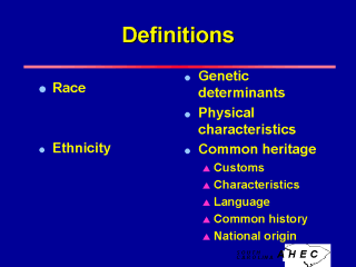 been used interchangeably for years but actually define two very different things. Race - Classification based on genetic characteristics - Anthropologists have classically defined three races in the human species, based primarily on physical characteristics: Negroid, Mongoloid, and Caucasoid. - Today, however, anthropologists stress the heterogeneity of the world’s population and many reject the concept of race outright. Ethnicity - A designation ascribed to a specific population or group of people having a common heritage distinguished by customs, characteristics, language, common history and national origin. - There are many ethnic groups within each race. - Used for identification rather than differentiation |