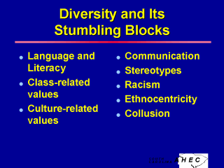| Overview slide: The next section will explore the topic of stumbling blocks to diversity. |