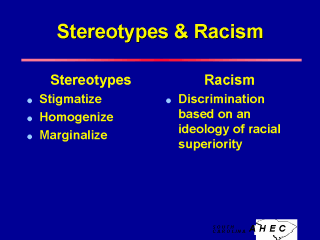 | Stereotypes - Categorization of people based on an artificial construction of a certain group - Designed to impart the essence of that group - Tends to homogenize the group, removing individuality and difference - Important to acknowledge that attempts to understand a particular culture can lead to stereotypic interpretation and ignores intergroup variation and personal preferences and needs. Racism - Act of discrimination based on an ideology of racial superiority - Any communication, action or conduct, whether intentional or unintentional, which denies recognition, benefits, rights of access or otherwise abrogates or derogates from recognized rights and freedoms of any person or community on the basis of their membership or perceived membership in a racial, ethnic or cultural community. - The fostering and promoting of uniform standards, common rules and same treatment of people who are not the same where the specificity of the individual or community is not taken into consideration. - The public dissemination of any communication or statement which insults a racial, ethnic or cultural community or which exposes them to hatred, contempt or ridicule. |