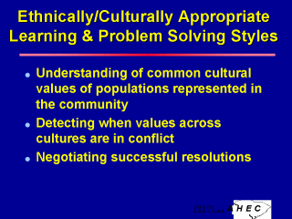 Cultural Groups Mastery over nature Harmony with nature Personal control over Doing-activity Being Time dominates Personal interaction Human equality Hierarchy Individualism/privacy Welfare of the group Youth Elders Self help Birthright inheritance Competition Cooperation Future orientation Past or present orientation Informality Formality Directness/openness Indirectness/ritual Practicality/efficiency Idealism Materialism Spiritualism/detachment From: Randall-David, E. Strategies for Working with Culturally Diverse Communities and Clients. Washington, DC: The Association for the Care of Children’s Health. 1989 |