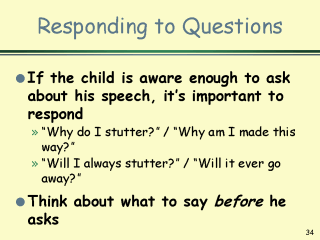 stuttering in a matter-of-fact way that: -conveys your acceptance of the child -helps to normalize stuttering (either as a normal part of learning, or as normal for your child) |