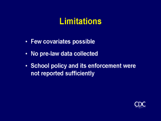 | Our results are subject to several limitations. First, in an observational survey such as this, few variables can be measured with any degree of accuracy. Second, in our study, we had only post-intervention data. Most observational studies use one-group pretest-posttest design. Finally, the existence and the enforcement of a school policy supporting the state law was not reported by enough schools to warrant analysis. |